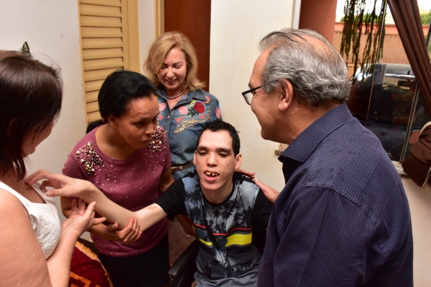 Dhyon Kennedy, de 21 anos, paciente de encefalopatia – doença cerebral por dano ou mau funcionamento – residente no Jardim Marista, recebeu na quinta-feira, 16, a visita do prefeito de Trindade, Jânio Darrot (PSDB), da primeira-dama, Dairdes Darrot, do presidente da Câmara, Hélio Braz (PSDB), da secretária de Saúde, Branca Ferreira, e da equipe do Programa Melhor em Casa, em especial o odontólogo Renerson Gomes. Além de Dhyon, o grupo esteve em outras três residências.