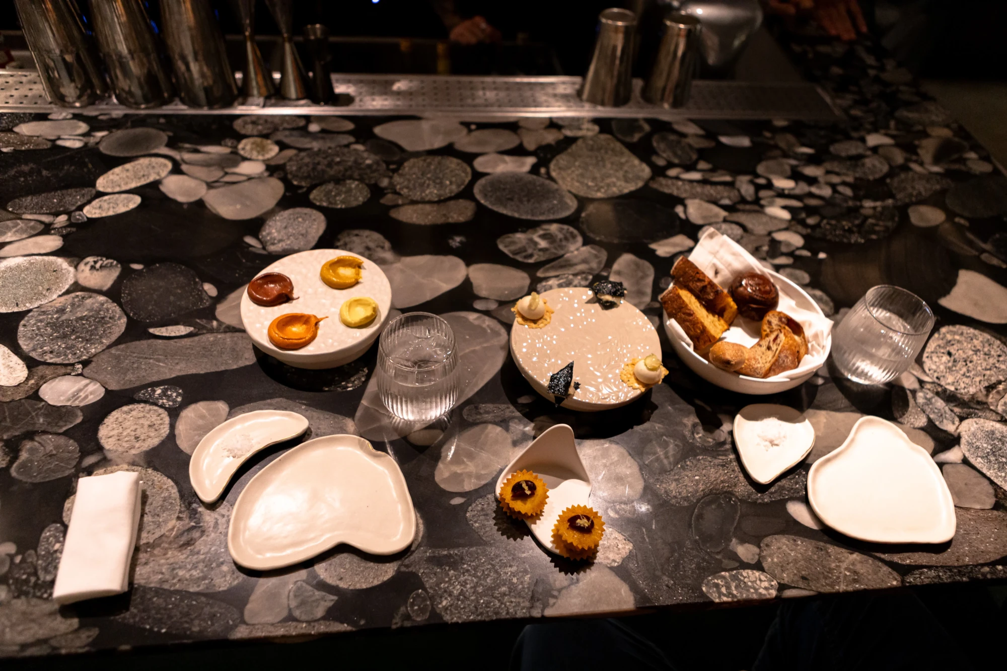 O couvert surge como uma pausa técnica e simbólica. Pães de fermentação própria, feitos ali mesmo, chegam acompanhados de manteigas aromatizadas: abóbora com castanha de baru, beterraba com limão, tomate defumado com pequi.