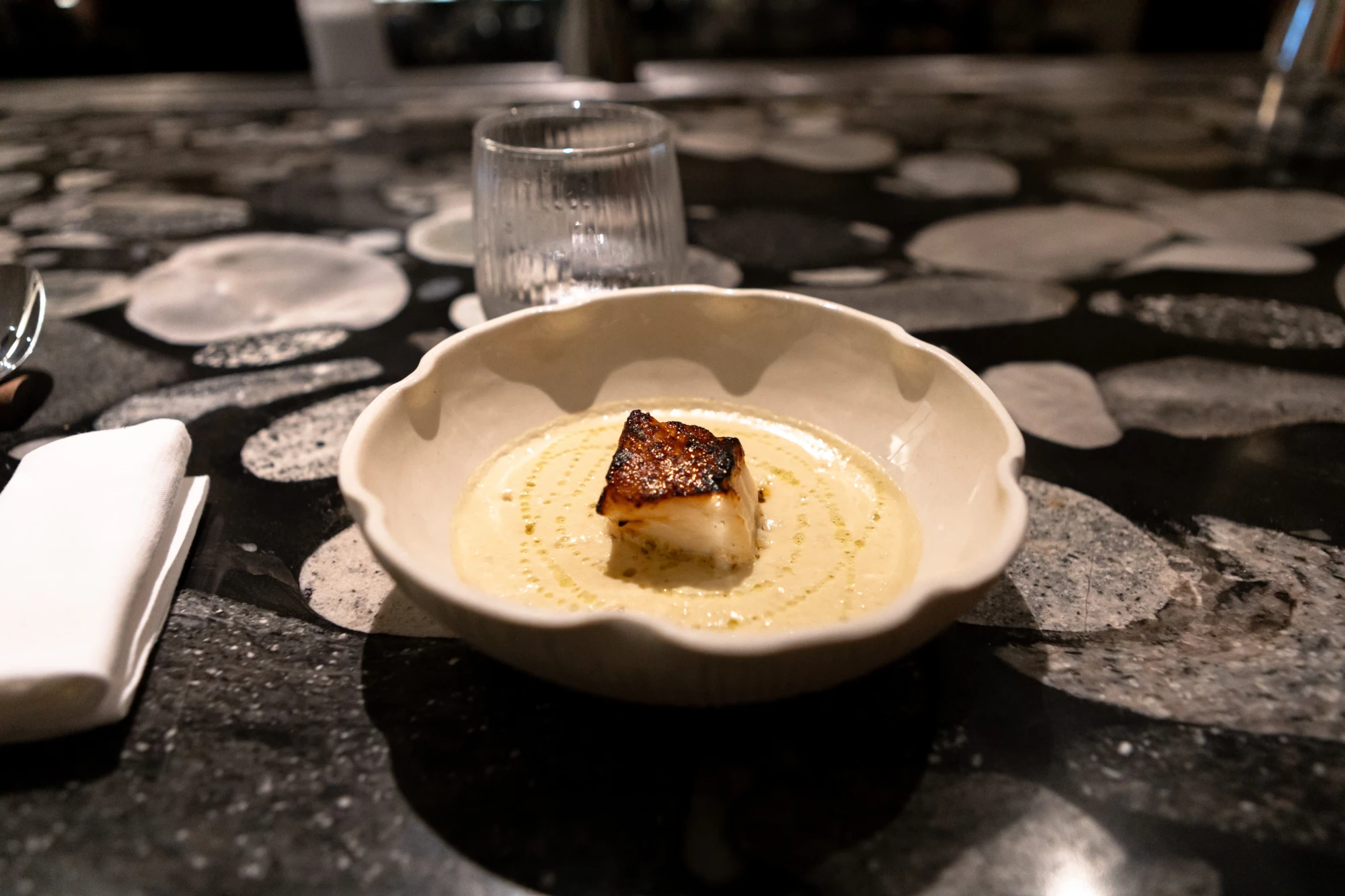 Um homus de buchão, um crudo de robalo coberto por um crocante de zaatar, tempero oriental, acompanhado de acerola, fruta que devolve o prato ao Cerrado. “A ideia de todos eles é um bocado só”, diz o atendente. A mensagem é clara: aqui, cada gesto é pensado para caber em uma única mordida.