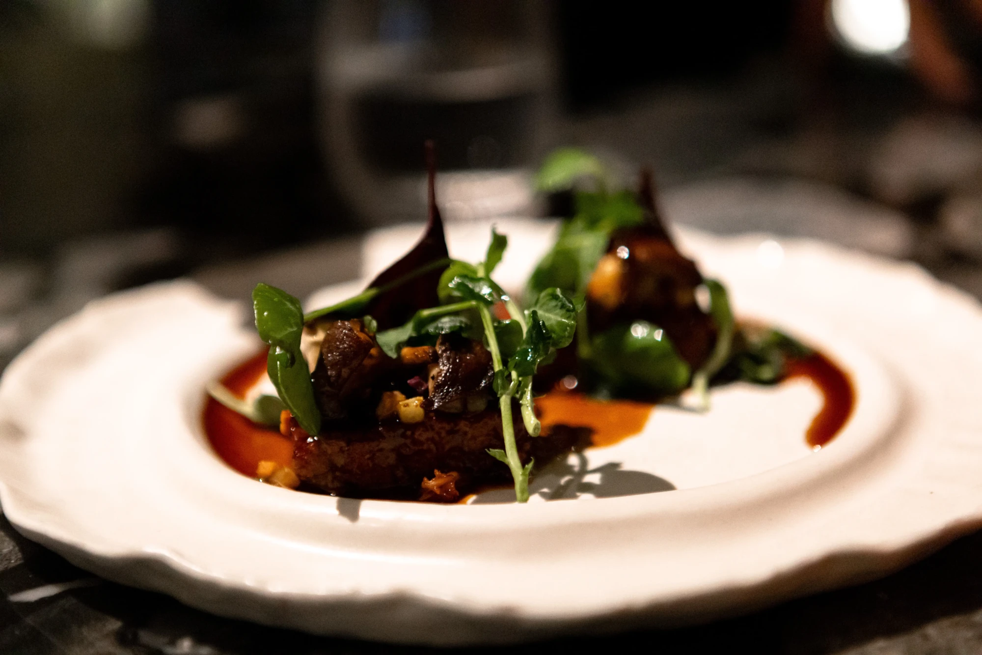 “É um molho japonês, mas pensado para o cupim”, explica a equipe. O molho chega quente, quase como um gesto final de cuidado. As sobremesas encerram a jornada sem quebrar o ritmo. Uma delas traz chocolate goiano, recheado com laranja e crocante, acompanhado de sorvete de gengibre e castanhas.