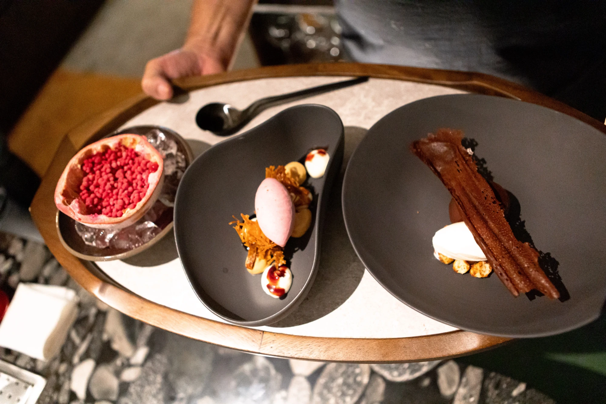 “É 245 reais, mas o nível de produto que você está comendo é um espetáculo”, afirma o chef. As sobremesas seguem uma lógica própria: uma etapa láctea, uma de chocolate e outra de fruta, compondo um percurso completo.