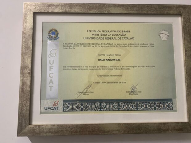 A UFCAT também concedeu a Haley Margon o título de doutor honoris causa. “Diante do exposto, a UFCAT reconhece o esforço contínuo do sr. Haley Margon Vaz na implantação e consolidação da UFG em Catalão, culminando na transformação em Universidade Federal de Catalão em 2018. É justo que a UFG e agora UFCAT demonstrem seu reconhecimento, conferindo-lhe o título honorífico de doutor honoris causa, conforme proposto pelos cursos e pela reitoria da UFCAT.”