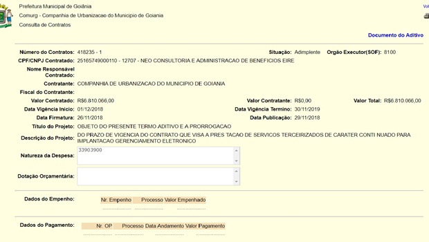 A Neo Consultoria mantém outro contrato com a Prefeitura de Goiânia, por meio da Companhia de Urbanização de Goiânia (Comurg), no valor de R$ 6,8 milhões, aditividade recentemente, mas não investigado pelo TCM neste primeiro momento. Em consulta no site da Prefeitura, não há notas de empenho ou pagamento de gastos da Comurg pelos cartões corporativos.