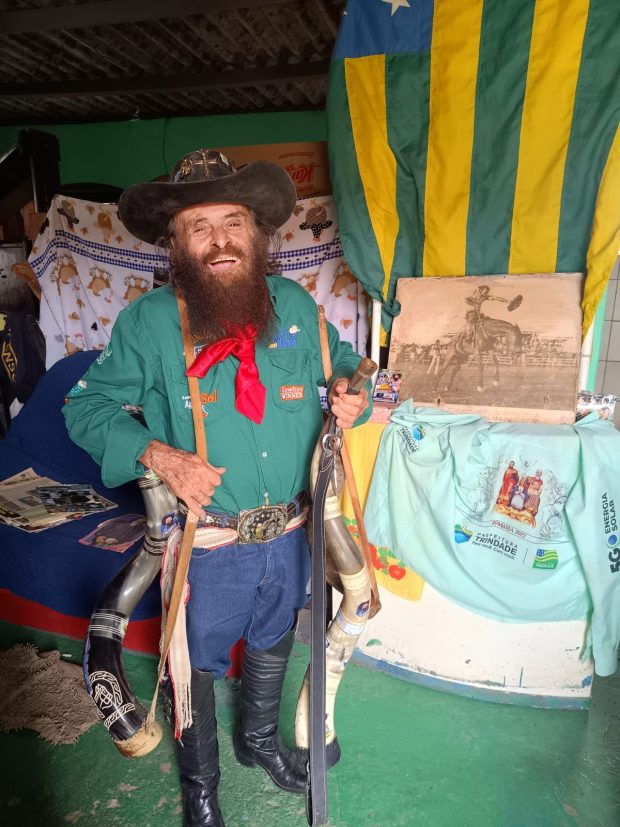 O peão descreve que, ainda na infância, tinha paixão pelo berrante e ele mesmo fabricou um a partir de uma cabaça. “Aprendi a tocar o berrante ainda criança. Na fazenda do meu avô, tinha uma árvore grande onde os boiadeiros costumavam descansar embaixo da sombra. Eu era muito curioso e pedi para os berranteiros me ensinarem, até que aprendi a soprar da forma correta e com meu berrante de cabaça fui aprimorando.” O berranteiro revela que seu primeiro berrante de verdade foi uma doação do fundador da Casa do Rodeio, “Seu Zé”, e o berrante o acompanha até hoje, sendo inclusive o berrante usado nas novelas.