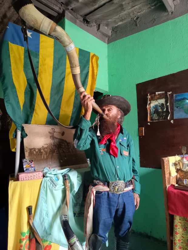 O peão descreve com tristeza no olhar e uma certa revolta o motivo pelo qual desistiu de montar. “Foram mais de 20 anos montando na festa de Barretos, mas nunca consegui o primeiro lugar. Eu sempre ficava entre os dez melhores, porém, teve uma em especial que todos os presentes me aplaudiram sem parar e eu sabia que nenhum peão foi melhor que eu, e ainda assim fiquei na sexta posição. Naquela hora, tive a certeza de que, infelizmente, ali não ganham os melhores, é uma máfia. Então, naquele momento, decidi que nunca mais montaria, e assim o fiz. Daí em diante, comecei a tocar meu berrante e estou assim até hoje.”