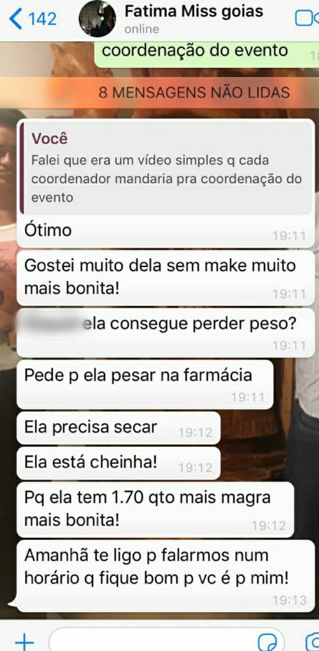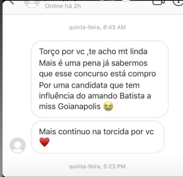 A concorrente Sara Prado foi uma das que receberam a mensagem. No texto enviado pelo perfil “jhonyjoy01”, uma pessoa dizia que torcia pela Miss Caçu, mas que infelizmente o concurso já estava comprado por uma candidata que teria apoio de um cantor goiano.