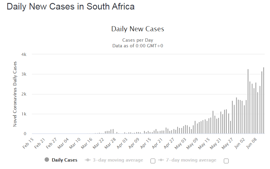 No dia primeiro de junho, as medidas de isolamento social foram afrouxadas pelo governo de Cyril Ramaphosa. A segunda-feira foi marcada pelo retorno ao trabalho de milhões de pessoas após dois meses de lockdown nacional. A quarentena sul africana, provocou uma queda no número de casos ativos da Covid-19 – de 23.700 em 8 de junho para 22.700 em 10 de junho. Entretanto, um novo aumento no número de novos casos forçou o governo a endurecer outra vez as regras de isolamento.