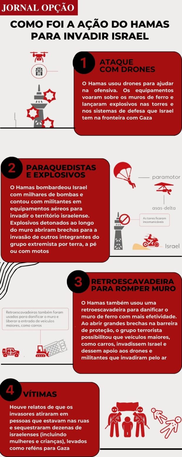 O Hamas bombardeou Israel com milhares de bombas e contou com militantes em equipamentos aéreos para invadir o território israelense. Explosivos detonados ao longo do muro abriram brechas para a invasão de outros integrantes do grupo extremista por terra, a pé ou com motos.