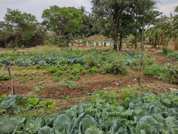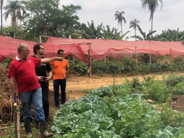 “Aqui temos o sistema de agrofloresta”, diz Valdir Misnerovicz, apresentando o local. “É uma combinação de plantas nativas e de alimentos. Bananeira, ipês, cravo, laranja, tamarindo, goiaba. Entre as árvores, temos a horta. Nessa couve, os pulgões atacaram. Combater a praga sem defensivos agrícolas; o que rendeu melhores resultados foi a urina de vaca e a pimenta malagueta. Também usamos como controle biológico as joaninhas e o bicho lixeiro (Chrysopidae), que comem os pulgões. Para a lagarta-cartucho e a lagarta-do-milho, usamos a microvespa Trichogramma, que parasita os ovos das pragas.”