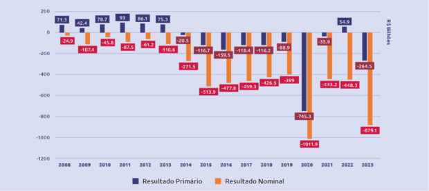 De acordo com o Tribunal de Contas da União (TCU), em 2021 houve uma redução significativa do déficit para R$ 35,9 bilhões, sendo que em 2022 ocorreu uma inversão de sinal de superávit de R$ 54,9 bilhões. No entanto, o TCU aponta que houve autorização legislativa para efetivar deduções no cálculo do resultado primário e, no ano de 2023, houve um déficit de R$ 264,5 bilhões. O superávit primário representa a diferença entre as receitas e os gastos do governo sem considerar o pagamento dos juros da dívida pública.