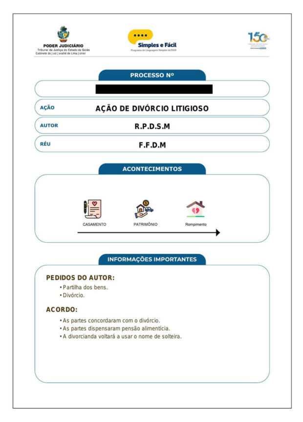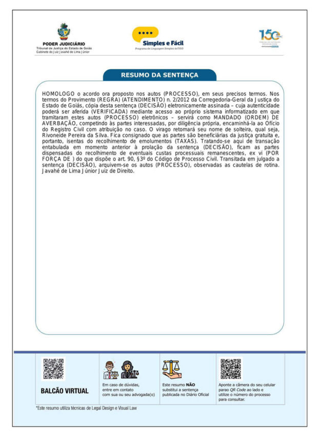 O fluxograma ilustrado de maneira didática, que é eficaz no que se refere a comunicar a decisão judicial de maneira simples, é o resultado do trabalho envolvendo os profissionais e cientistas da universidade e do judiciário goiano. É necessário que o desafio diário seja o exercício de se manifestar com uma linguagem que não afaste o indivíduo de fora do âmbito judicial. Frente a isso, o Tribunal possui guias de bolso e um glossário, como cartilha de linguagem simples. Além de promover cursos e webinários que orientam e incentivam assessores, assistentes, juízes e desembargadores a serem mais acessíveis em suas linguagens.