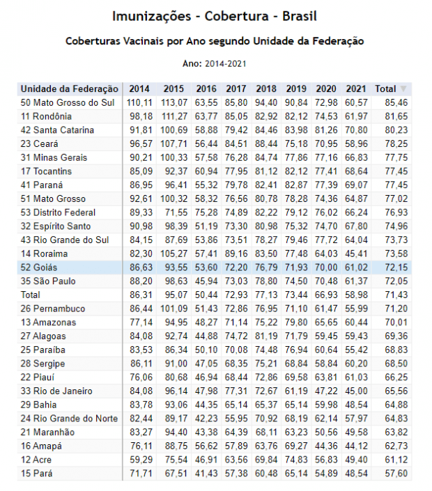 Goiás esteve entre os estados com maior cobertura vacinal Brasil do ano de 2000 até 2014, chegando em 2011 a ser a unidade da Federação que vacinava a maior porcentagem de sua população alvo. Entretanto, o estado caiu para 12º lugar na lista no último ano. A taxa de abandono do programa de imunização, que era a menor do país em 2015, decolou para 25% em 2021.