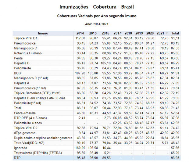 Imunizantes aplicados nos recém-nascidos, como a BCG, que protege contra tuberculose e é aplicada ainda na maternidade, foi a vacina que sofreu maior queda em pontos percentuais: em 2014 foi aplicada em 107% do público alvo; em 2021, em apenas 68%. A vacina dTpa para gestantes, que protege o bebê contra difteria, tétano e coqueluche, atingiu apenas 43% em 2021. Para as vacinas que necessitam de mais de uma dose, a taxa de abandono (ou seja, de responsáveis que deixaram de levar crianças para tomar a dose de reforço) atingiu no ano passado a marca de 19,6%.