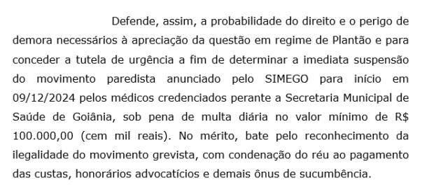 O Município de Goiânia argumentou que não houve prévia negociação entre as partes e defendeu que a greve seria ilegal e abusiva. O pedido do prefeito Rogério Cruz foi atendido, e o desembargador determinou multa diária de R$ 100 mil em caso de descumprimento da decisão.