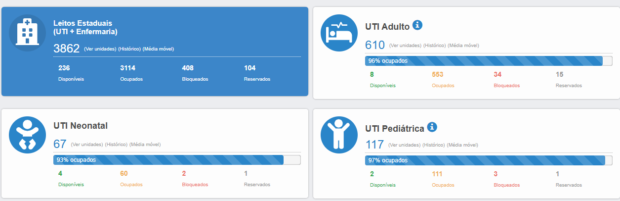 Segundo a Secretaria, no painel de leitos disponível no site da SES é possível verificar a disponibilidade de leitos nas unidades de UTIs pediátricas, neonatal, Unidade de Cuidados Intermediários Neonatais (UCIN) e para adultos.