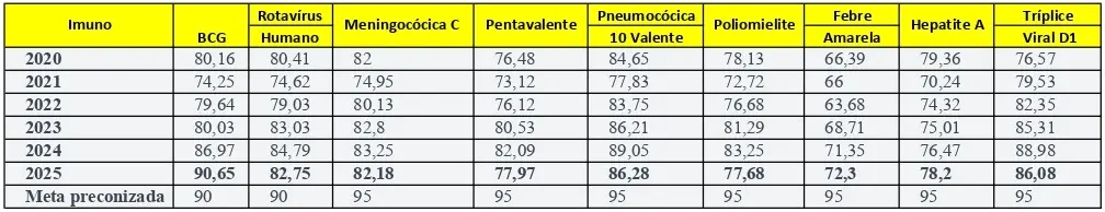Observa-se uma tendência geral de recuperação após quedas em 2021, especialmente nas vacinas BCG, Pentavalente, Pneumocócica 10 Valente e Tríplice Viral D1. Em 2025, apenas a BCG atingiu a meta preconizada de 90%, enquanto as demais ainda permanecem abaixo do ideal de 95%.