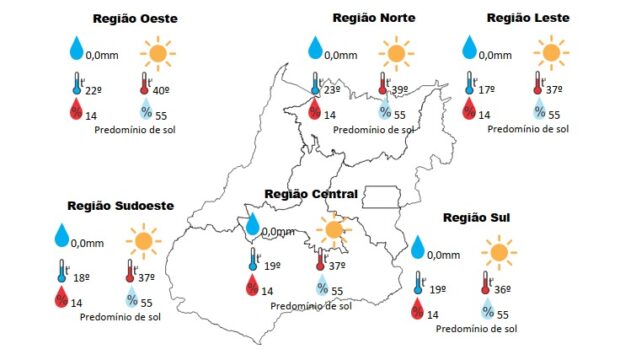 O boletim de previsão do tempo mais recente emitido pelo Cimehgo ainda acusa um cenário típico do inverno goiano. Altas temperaturas e baixa umidade relativa do ar predominam em todo o estado. Neste sábado, 21, e domingo, 22, Goiás tem previsão de umidade relativa do ar mínima na casa dos 14% e máxima de 55%, em todas suas regiões. A temperatura mínima prevista foi de 18°C na região Sudoeste, e a máxima registrada foi de 40°C na região Oeste.