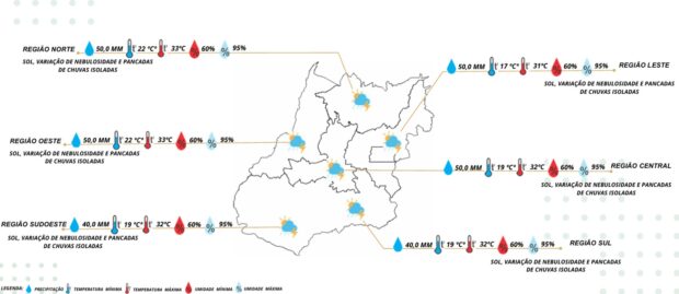 As regiões Norte e Oeste possuem temperatura mínima prevista em 22°C e máxima de 33°C. Já nas regiões Central, Sul e Sudoeste, as temperaturas podem ir de 19°C a 32°C ao longo do dia. A área com menores temperaturas em Goiás nesta quarta-feira, 15, é a região Leste, com mínima prevista em 17°C e máxima de 31°C.