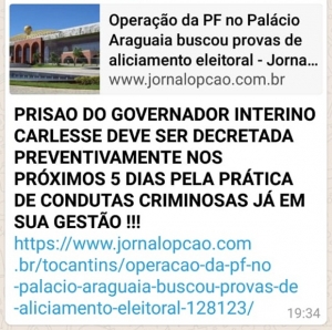 Com uso do link da matéria “Operação da PF no Palácio Araguaia buscou provas de aliciamento eleitoral”, escrita na manhã desta sexta-feira (15/6) pelo repórter Dock Jr., uma imagem com uma notícia falsa tem circulado nas redes sociais e é compartilhada pelo aplicativo de mensagens WhatsApp. O conteúdo da informação inverídica avisa, com uso de letras maiúsculas e discurso sensacionalista, o seguinte: “PRISAO DO GOVERNADOR INTERINO CARLESSE DEVE SER DECRETADA PREVENTIVAMENTE NOS PRÓXIMOS 5 DIAS PELA PRÁTICA DE CONDUTAS CRIMINOSAS JÁ EM SUA GESTÃO !!!”.