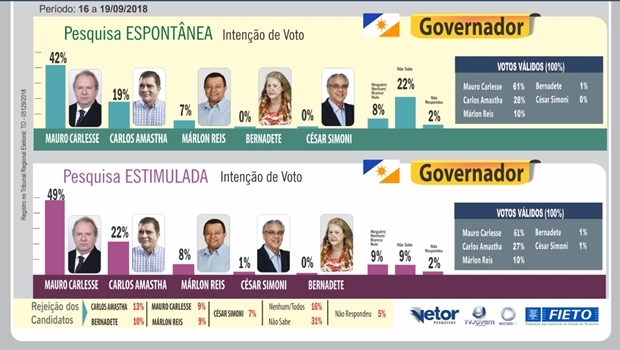 De acordo com segunda rodada da pesquisa feita pela Federação das Indústrias do Estado do Tocantins (Fieto) e pela Vetor Pesquisas, Mauro Carlesse (PHS) venceria a eleição para governador do Tocantins ainda no primeiro turno. A pesquisa divulgada nesta sexta-feira (21/9) mostra Carlesse com 49% das intenções de votos na pesquisa estimulada, seguido de Carlos Amastha (PSB), com 22%.