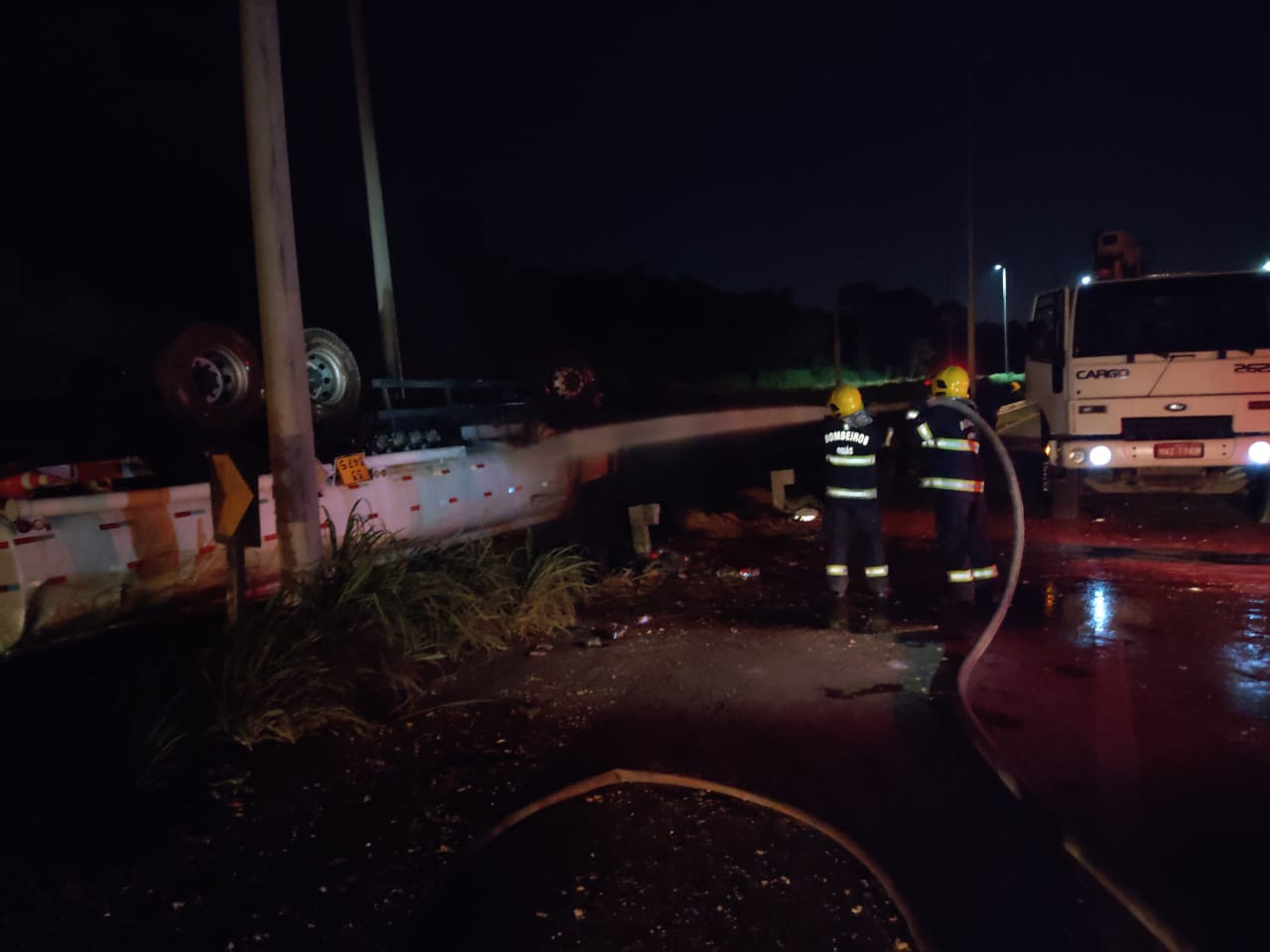 O Corpo de Bombeiros não informou como a carreta sofreu o tombamento.