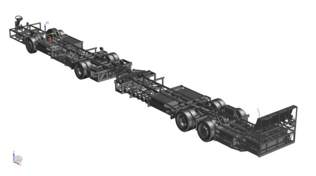 Chassi tubular que não necessita alongamento para carrocerias até 23 metros. Estrutura constituída por materiais de alta resistência à torção e à flexão.