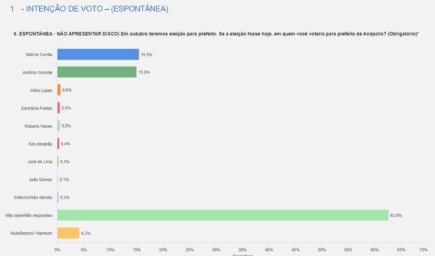 Diante da pergunta “Se a eleição fosse hoje, em quem você votaria para prefeito de Anápolis?”, Hélio Lopes (PSDB) foi lembrado por 0,6% dos entrevistados. Eerizania Freitas (UB) vem em seguida, com 0,5%. O atual prefeito Roberto Naves (Republicanos) não pode se candidatar novamente, mas também foi lembrado por 0,5% dos eleitores. Kim Abrahão (PSD) teve 0,4% das menções e José de Lima (PMB) por 0,3%. Não sabe/Não respondeu: 60%.