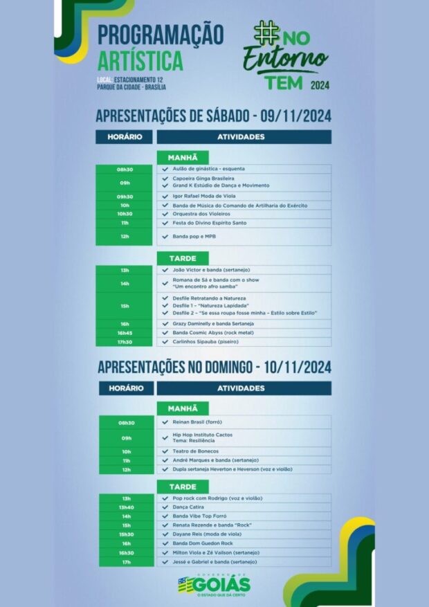 A feira contará com a apresentação de novos artistas indicados pelos municípios do Entorno para destacar a rica diversidade cultural da região. O público poderá prestigiar desde bandas marciais e manifestações religiosas e tradicionais, como a folia da Festa do Divino Espírito Santo, até apresentações de capoeira, MPB, samba, pop rock, hip-hop e forró.