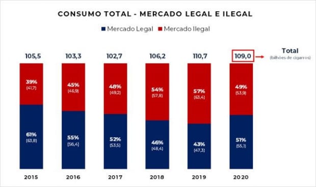 Nova pesquisa do Ibope Inteligência/Ipec aponta que, em 2020, ano marcado pelo enfrentamento da pandemia da COVID-19, a ilegalidade respondeu por 49% de todos os cigarros consumidos no Brasil, sendo que 38% foram contrabandeados principalmente do Paraguai e 11% foram produzidos no Brasil, por fabricantes classificados como devedores contumazes, que fazem do não pagamento de impostos o seu negócio. Com isso, 53,9 bilhões de cigarros ilegais inundaram as cidades brasileiras no último ano. A pesquisa foi divulgada pelo Instituto Brasileiro de Ética Concorrencial (ETCO).