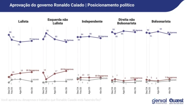 O levantamento indica que Caiado tem aprovação de 84% dos entrevistados, índice que permanece acima dos 80% desde abril de 2024. A desaprovação soma 11%, enquanto 5% não souberam responder.