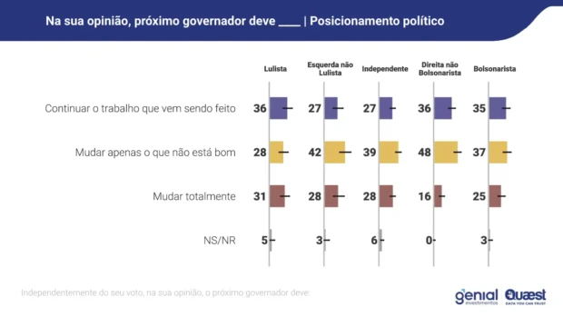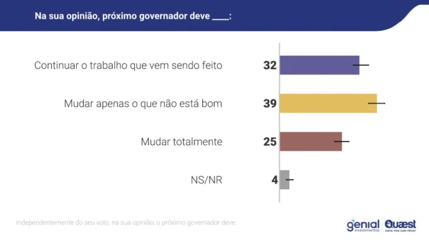 Para 36% dos entrevistados, o próximo governador deve dar continuidade ao trabalho atual. Outros 42% defendem mudanças pontuais. A maioria (58%) rejeita uma mudança total, enquanto apenas 20% apoiam essa possibilidade.