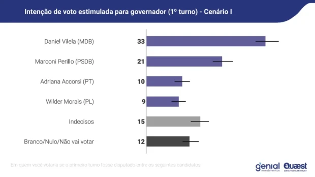 A sondagem mostra que Daniel Vilela lidera a corrida pelo governo de Goiás com folga. Vilela aparece com 33% das intenções de voto, seguido por Marconi Perillo, que soma 21%. Na sequência estão Adriana Accorsi (10%) e Wilder Morais (9%), no primeiro cenário.