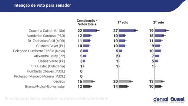 Para o Senado, Gracinha Caiado lidera com 22% das intenções de voto, seguida por Vanderlan Cardoso (12%) e Zacharias Calil (11%). Gustavo Gayer aparece com 10%.
