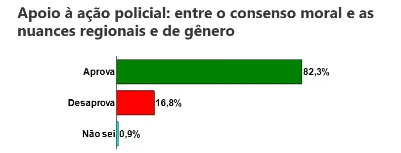O apoio à operação é mais forte no interior do estado (88,5%) do que na região metropolitana (79,4%), refletindo diferenças regionais na percepção da violência e na exposição midiática. A pesquisa também registrou variação por gênero: 87,2% dos homens aprovaram a ação, contra 77,5% das mulheres, que demonstraram maior sensibilidade ao número de mortos e à dimensão humanitária do confronto.