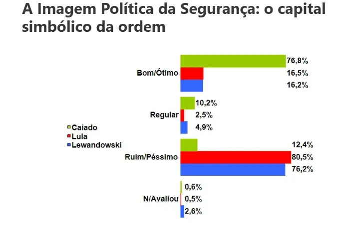A avaliação dos agentes políticos reflete essa percepção de autoridade e ordem. O governador Ronaldo Caiado é aprovado por 76,8% dos entrevistados na área de segurança, enquanto o presidente Luiz Inácio Lula da Silva recebe avaliação negativa de 80,5% e o ministro da Justiça, Ricardo Lewandowski, de 76,2%. Já o gesto de Caiado de apoiar publicamente a operação junto a outros governadores de perfil conservador foi aprovado por 79,7% dos goianos, reforçando sua imagem como liderança técnica e moral no campo da segurança.