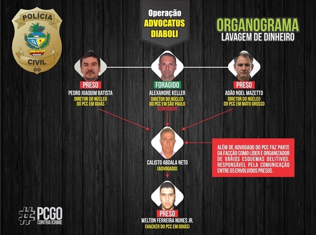 Segundo a PC, em Goiás, no que tange aos delitos praticados pelos faccionados, a organização foi completamente desarticulada com a prisão de Calisto Abdala Neto.