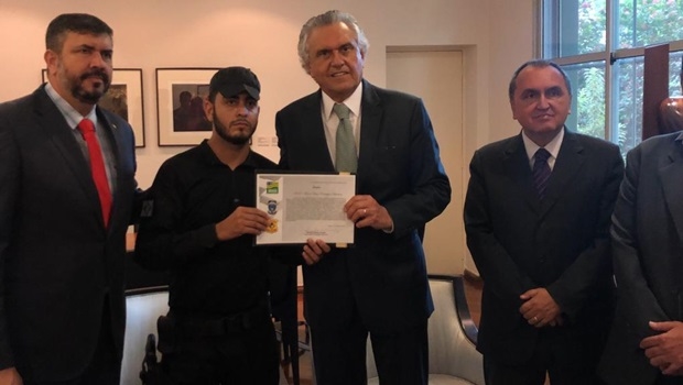 Recebido no gabinete do governador no Palácio das Esmeraldas, o agente de segurança prisional do Presídio Estadual de Anápolia, Maicol Victor Barbosa, ganhou homenagem de Ronaldo Caiado (DEM) nesta sexta, 15, após recursar tentativa de suborno de reeducando.