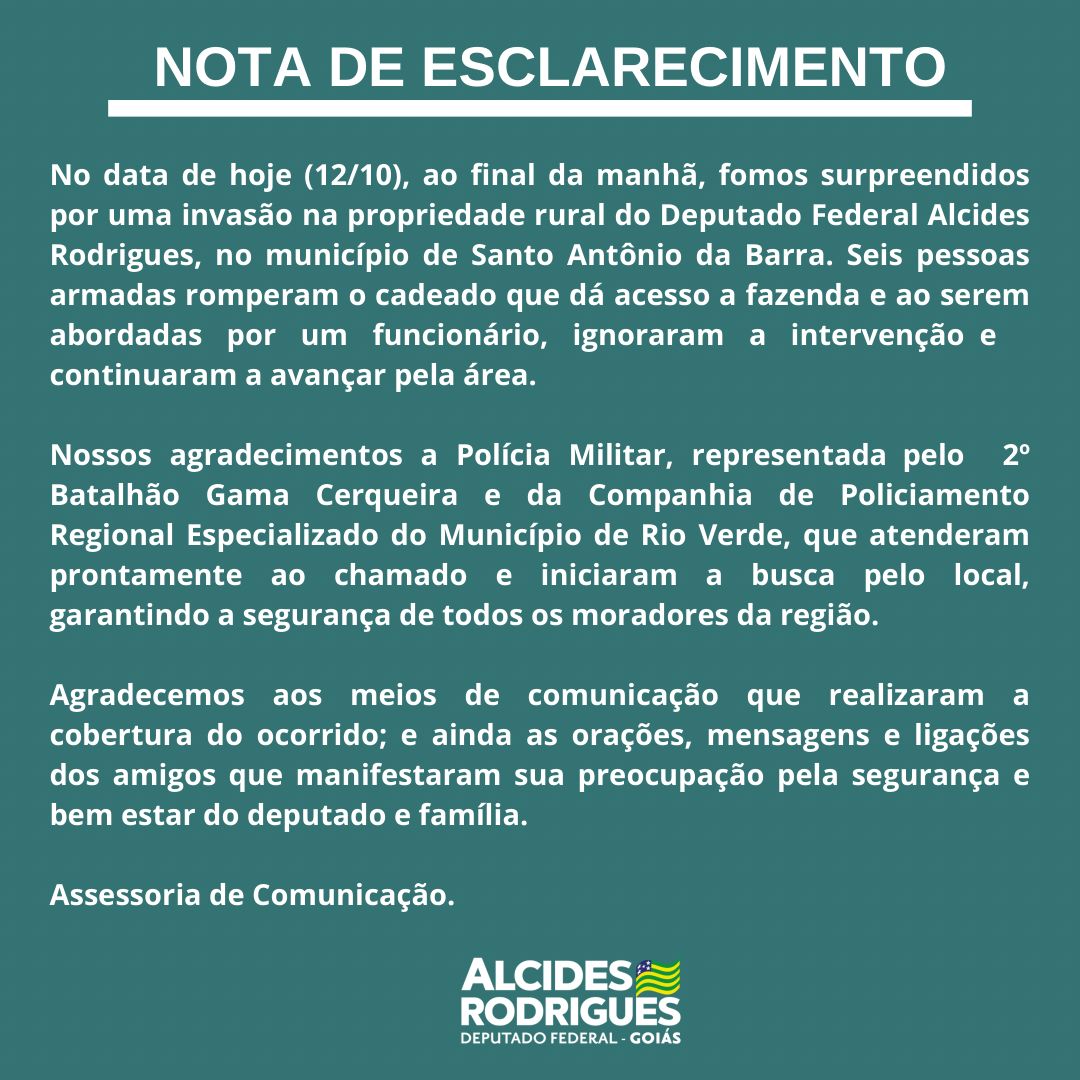O ex-governador Alcides Rodrigues se manifestou sobre a invasão em sua fazenda, em Santo Antônio da Barra, na última terça-feira (2), por seis homens armados. Em nota, o também ex-parlamentar agradeceu apoio recebido de amigos e destacou o trabalho da Polícia Militar e dos veículos de comunicação.