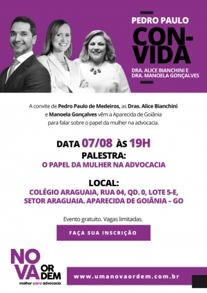 O advogado e pré-candidato à presidência da OAB-GO, Pedro Paulo de Medeiros, recebe as advogadas Dras Alice Biachini e Manoela Gonçalves para falar sobre o papel da mulher na advocacia. O evento acontece nesta terça-feira (7/8), às 19h30, no Colégio Araguaia, Setor de mesmo nome, em Aparecida de Goiânia.