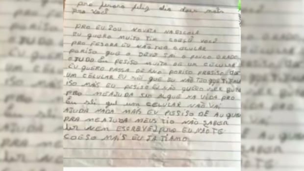Na carta, a estudante comenta sobre sua dificuldade em realizar as atividades escolares, pois seus tios não sabem ler. Com isso, a estudante pediu um celular para conseguir participar das aulas online e diz: “Me ajuda ser alguém na vida” (sic).