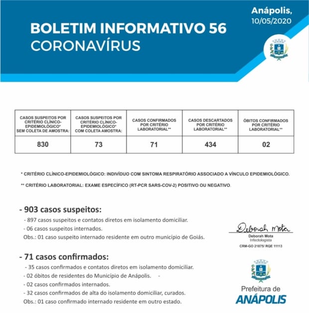 Em boletim informativo, a prefeitura de Anápolis confirmou, neste domingo, 10, a segunda morte de paciente residente no município por Covid-19. O homem de 59 anos foi atendido na UPA dia 24/04 e após avaliação médica foi internado inicialmente na unidade Norma Pizzari Gonçalves, em Anápolis.