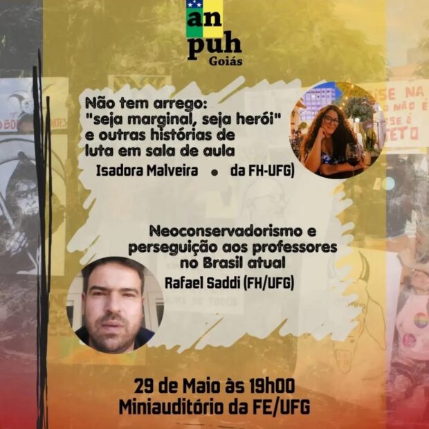 O tema do debate é “Liberdade de cátedra sob ataque: denuncismo e assédio aos professores” com a palestrante Isadora Malveira (FH/UFG). Além disso, o palestrante Rafael Saddi falará sobre “Neoconservadorismo e perseguição aos professores no Brasil atual”.