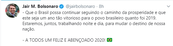 Nas redes sociais o presidente desejou que 2020 seja um ano "tão vitorioso para o povo brasileiro quanto foi 2019"
