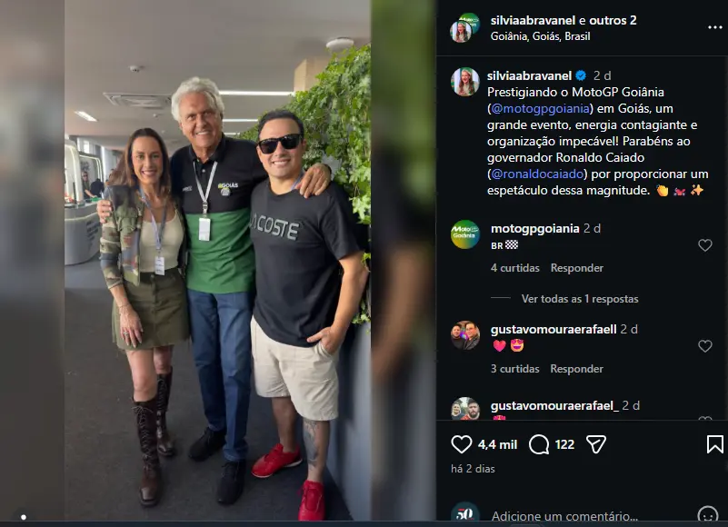 Vale destacar que, no último fim de semana, Silvia Abravanel esteve em Goiânia para acompanhar o MotoGP. Ela chegou a publicar uma foto no seu Instagram ao lado do governador Ronaldo Caiado (PSD) elogiando o evento.