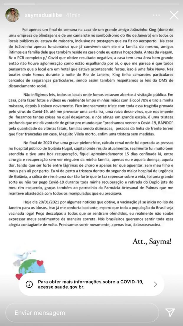 Na tarde desta quarta-feira, 20, a blogueira usou as redes para um comunicado, onde relata que foi a até a capital carioca visitar um amigo, e que “em todos os locais públicos eu estava de máscara, inclusive na postagem que eu fiz no aeroporto. Antes da viagem fiz o PCR completo, que obtive resultado negativo, a casa tem uma área bem grande, então não houve aglomeração como estão espalhando por ai”, escreve.