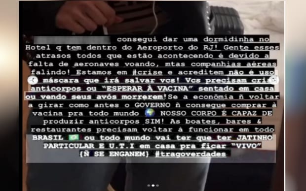 “Muitas companhias aéreas falindo. Estamos em crise e, acreditem, não é o uso de máscaras que vai salvar vocês”, diz outro trecho da postagem que foi compartilhada na terça-feira, 19, por um perfil de uma rede social criado para denunciar brasileiros em momentos de confraternização ou aglomeração em meio à pandemia.