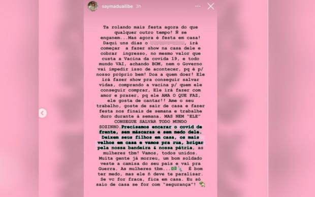 Sayma defendeu a abertura de boates, bares e restaurantes e escreveu que “nosso corpo é capaz de produzir anticorpos. Boates, bares e restaurantes precisam voltar a funcionar em todo o Brasil ou todo mundo vai ter que ter jatinho particular e UTI em casa para ficar vivo”.