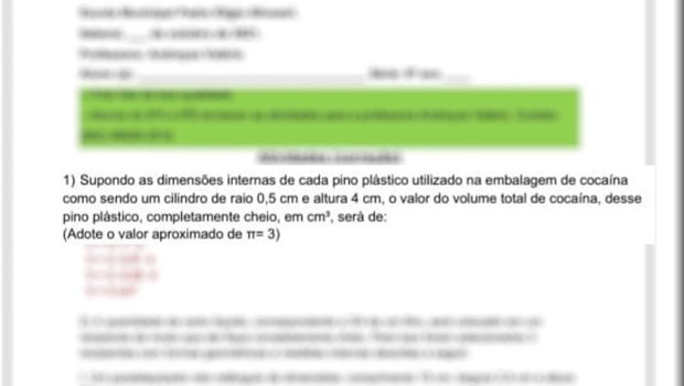 A tarefa apresentava uma questão que pedia o cálculo da quantidade de cocaína colocada em um pino de plástico. O exercício foi enviado para a casa dos alunos do 8º ano das turmas A e B. O promotor de Justiça Marcelo Faria da Costa Lima, em substituição na 2ª PJ, esclareceu que a reunião foi convocada para verificar quais medidas foram adotadas em relação ao caso.
