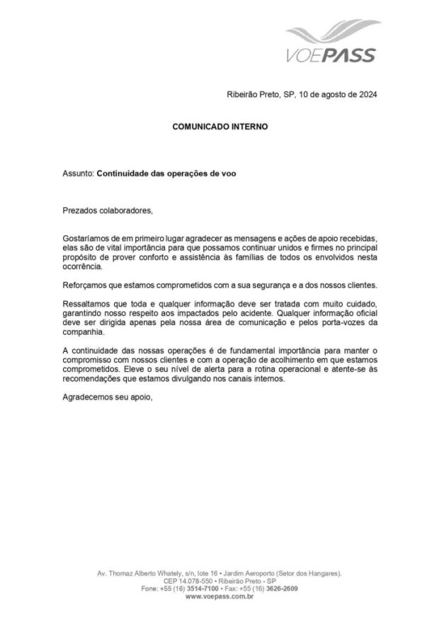 Após o acidente que matou 62 pessoas em Vinhedo, São Paulo, a VoePass emitiu comunicado pedindo aos funcionários que eles “elevassem o nível de alerta para a rotina operacional”. Um avião da companhia que fazia o trecho Cascavel (PR) a Guarulhos (SP) caiu na última sexta-feira, 9, matando todos os ocupantes.