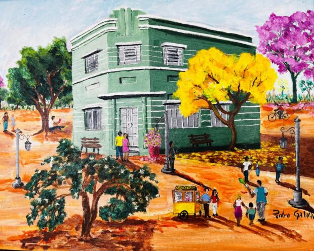 “Esse prédio é o antigo fórum e a prefeitura de Campinas. E o que eu fiz aqui? A ideia minha foi que em frente houvesse uma praça. Essa praça é a Praça Joaquim Lúcio. Eu a projetei de forma a preservar a própria natureza do cerrado, onde os galhos tortos contracenam com a arquitetura que apresenta linhas coordenadas, tanto verticais quanto horizontais”, explica Pedro Galvão, presidente da AGAV (Associação Goiana de Artes Visuais).
